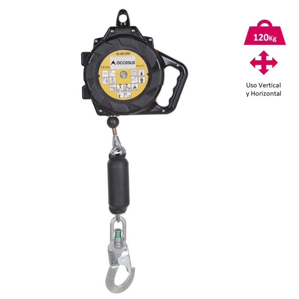 Anticaídas retráctil modelo ANR 250 H-V cable de acero con carcasa de plástico. Este nuevo modelo (ANR 250 H-V) es más ligero así como supone una mejora respecto a su modelo homólogo (ANR 250 V), pues estaría diseñado para uso vertical y horizontal. El dispositivo lleva un sistema de absorción anticaídas cerca del gancho y no necesita añadirle ningún otro equipamiento como la eslinga 610500-018 para ser usado de forma horizontal.
