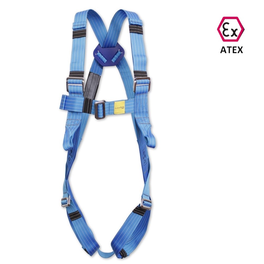 Arnés para trabajos en atmósferas explosivas, especialmente diseñado para empresas petroquímicas e industria minera, con 1 punto de anclaje dorsal en aluminio forjado. + 1 punto de anclaje  esternal. Regulable en hombros y muslos. Cinta pélvica. Hebillas en acero inoxidable. Se suministra con bolsa de nylon.