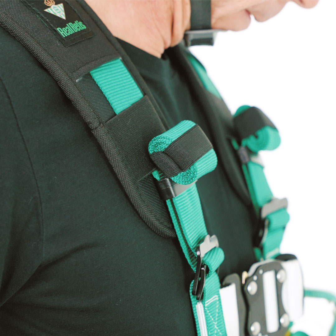 El ARNÉS de SEGURIDAD OFICIAL del REAL BETIS BALOMPIE ofrece una magnifica oportunidad de lucir los colores de tu equipo mientras trabajas seguro. Las principales características del arnés son máximo confort y calidad, con cinturón de posicionamiento. Cuenta con un punto de anclaje dorsal A y dos puntos de anclaje frontales A/2, que además está homologado para rescate. Perfecto para un uso intensivo del arnés y para aquellos profesionales que necesiten un arnés anticaídas, de posicionamiento y rescate ergonómico y robusto.