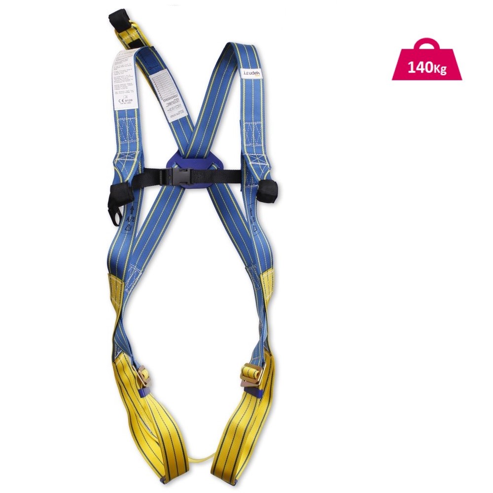 Arnés a 2 colores con 1 punto de anclaje dorsal y cinta de extensión + 1 punto de anclaje esternal. Regulable en muslos. Cinta pectoral. Cinta pélvica.
