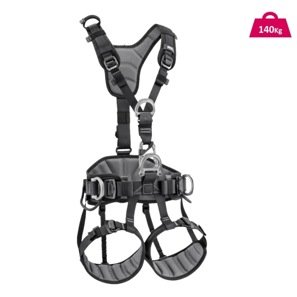 – Todas las zonas de contacto, tirantes, cinturón y perneras, con espuma preformada y acolchada de tejido transpirable, permiten al usuario evolucionar y trabajar confortablemente.