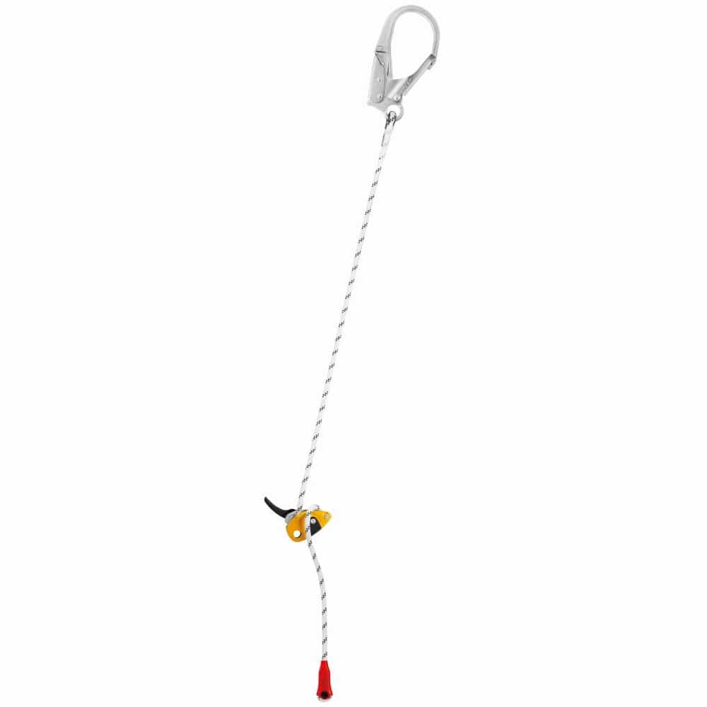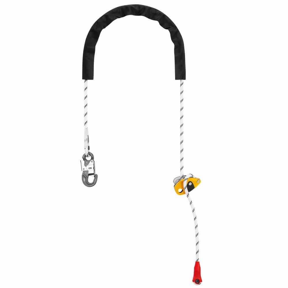 Terminales cosidos en las dos puntas con funda plástica para mantener el conector en posición y proteger la cuerda de la abrasión. Funda de protección que permite proteger la cuerda de los puntos de contacto agresivos, favoreciendo al mismo tiempo su deslizamiento. Esta protección es amovible, lo que permite ascender lo más cerca posible del anclaje cuando el elemento de amarre se utiliza en simple. Fabricante Petzl.