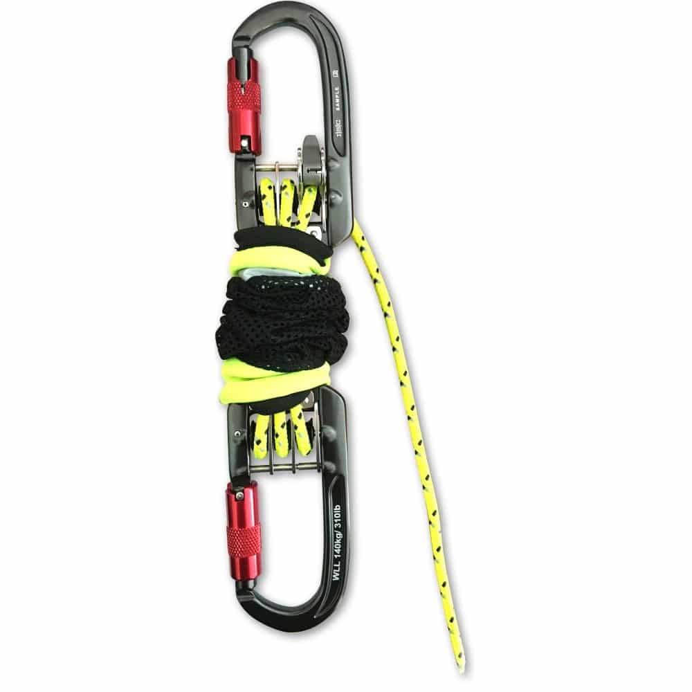 El HaulerBiner se suministra en una bolsa de bolsillo doble, para un fácil despliegue y almacenamiento en el arnés del usuario.