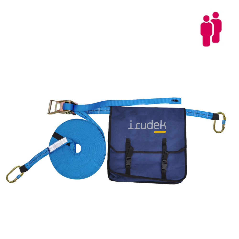 Línea de vida temporal con cinta textil y tensor. X2 puede ser utilizada por 2 personas simultáneamente en modo anticaídas. Longitud regulable en tramos de 2 a20 metros.
