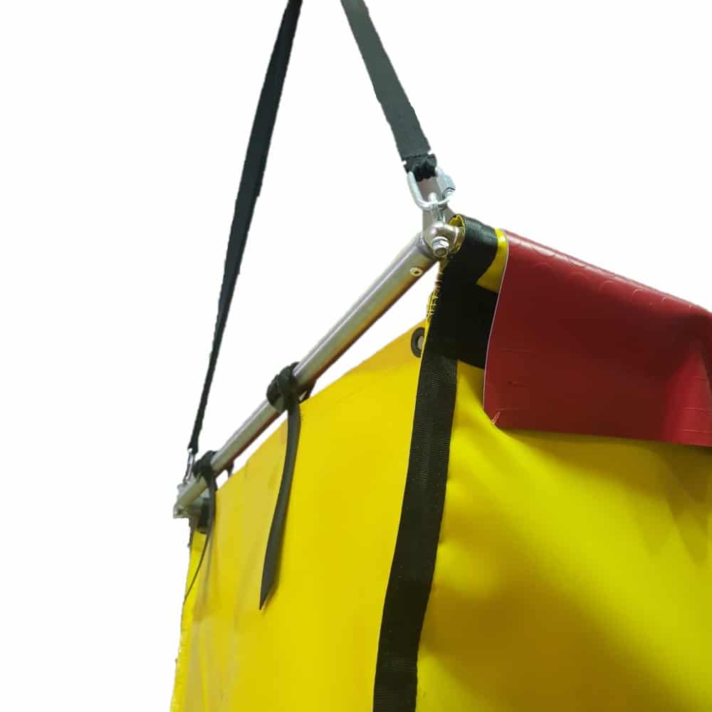 Ménsula 135 Largo por 65 de ancho por 53 de fondo. De tubo de acero inoxidable mate de 2,1 cm de diametro, por 2,6 mm de espesor. Ángulo de esquina de latón, relleno con masilla de poliester. Mosquetón de 6mm para izado. Suelo interior de PVC. Incluye funda de transporte.