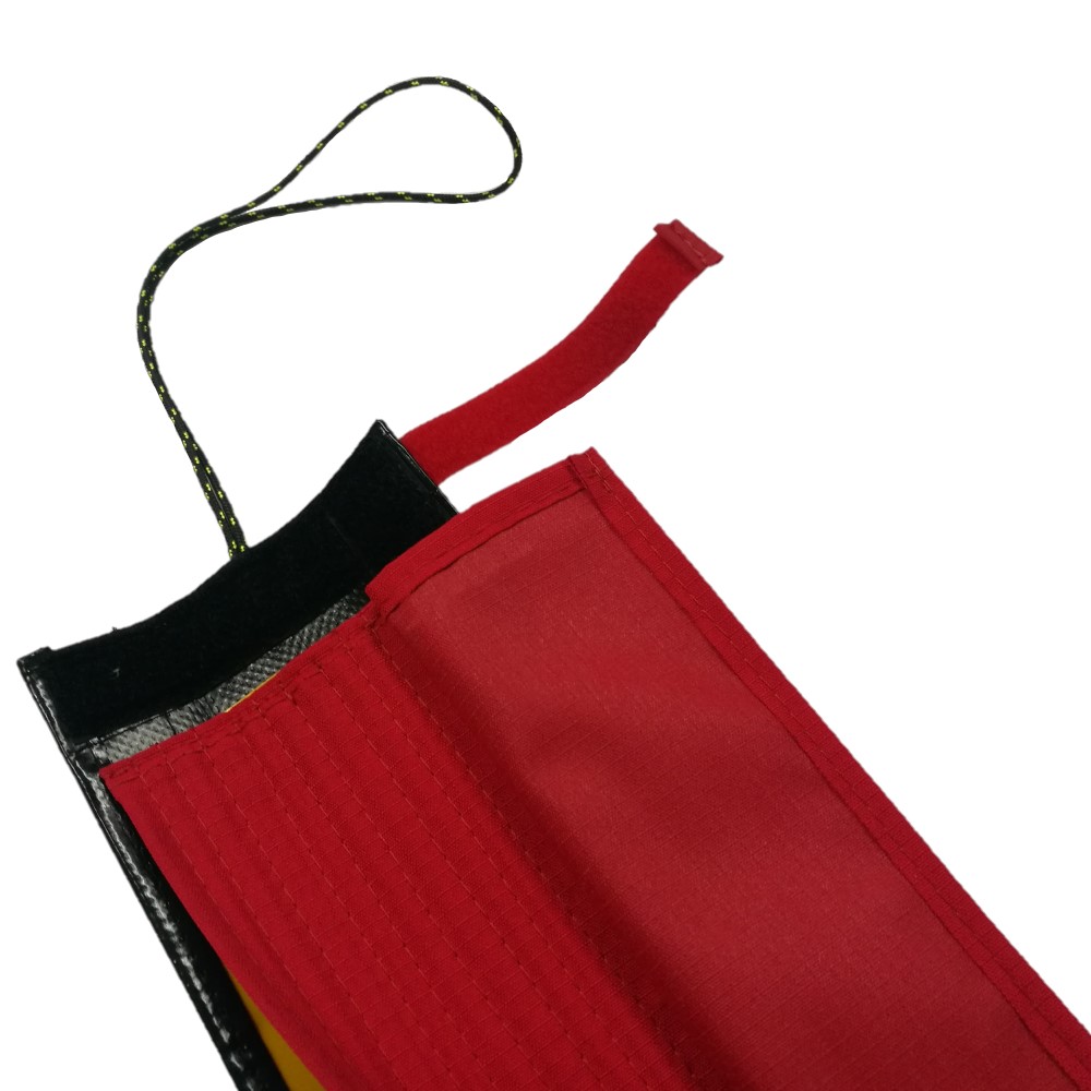 Tres capas de CORDURA roja con TEFLON y con propiedades antidesgarro y antiabrasivo. Extremadamente robusta y muy fuerte, repelente al agua.