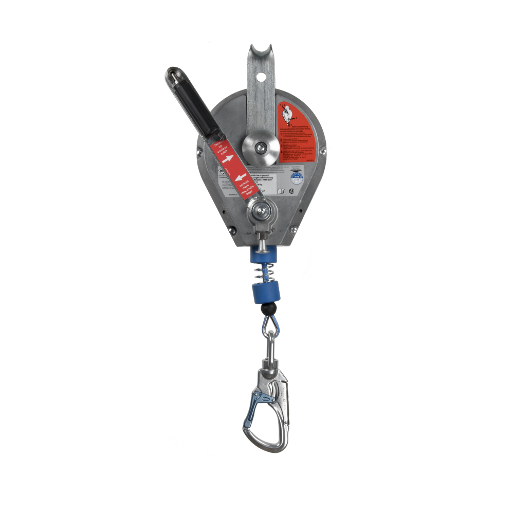 Rescatador para trípode MIRA HRA con cable de acero, carcasa de aluminio, manivela para rescate y gancho de aluminio giratorio con cierre y bloqueo automático.